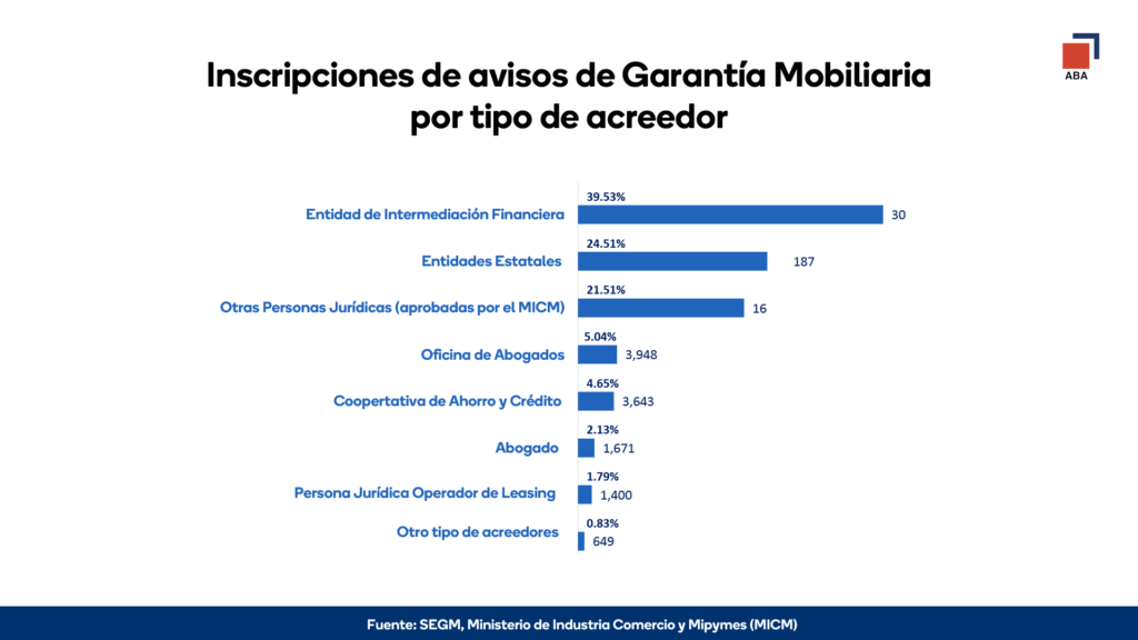 La ABA puntualizó que, entre los acreedores, las entidades de intermediación financiera conforman el 15.7% de los usuarios que inscriben garantías y el 2.8% corresponde a personas jurídicas operadoras de factoring y leasing.