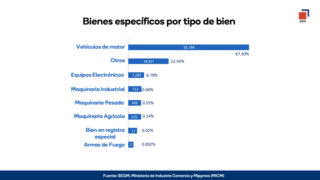 El mayor número de bienes específicos inscritos corresponde a vehículos de motor (67.20%), así como equipos electrónicos, maquinarias pesadas y agrícolas, entre otros, indicó un informe de la Dirección Legal de la ABA. Detalla que 83,022 de estos bienes, cerca de la tercera parte de la totalidad, se inscribió conforme a la nueva normativa.