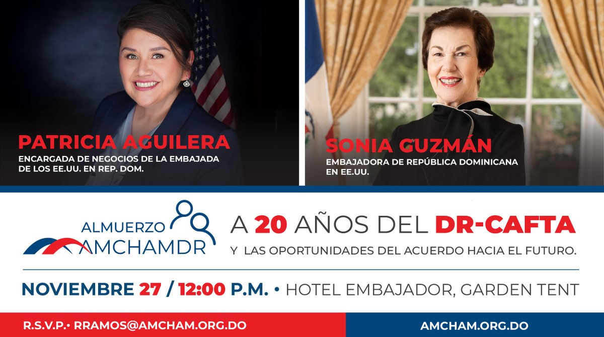 Santo Domingo, R.D. Noviembre 18, 2024.- La Cámara Americana de Comercio de la República Dominicana (AMCHAMDR por sus siglas en inglés) realizará su almuerzo mensual correspondiente al mes de noviembre, que contará con la participación de Patricia Aguilera, Encargada de Negocios de la Embajada de los Estados Unidos en República Dominicana, y Sonia Guzmán, Embajadora de la República Dominicana en los Estados Unidos, quienes abordarán la histórica relación comercial entre ambas naciones y en donde se conmemorará los 20 años del Tratado de Libre Comercio entre República Dominicana, Centroamérica y Estados Unidos (DR-CAFTA), repasando los logros y analizando el futuro del mismo.