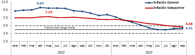A tal efecto, durante el presente año, la combinación del corte restrictivo de la política monetaria junto a los subsidios del gobierno congelando el precio interno de los combustibles y pausando los ajustes de la tarifa eléctrica tuvieron éxito e hicieron posible que la inflación se redujera de 9.64 % en abril 2022 a 4.41 % en septiembre 2023. Asimismo, la inflación subyacente, que excluye los precios de los componentes más volátiles de la canasta como algunos alimentos, los combustibles y otros artículos con precios regulados, disminuyó de 7.29 % en mayo de 2022 a 4.68 % en septiembre de 2023. Como se puede apreciar, ambas medidas se encuentran en la actualidad dentro del rango meta de 4%±1% del Programa Monetario y tanto las expectativas de los analistas del mercado como los modelos econométricos de pronóstico del Banco Central apuntan a que ambos indicadores de inflación se mantendrán dentro del rango objetivo durante el resto de 2023 y el 2024.