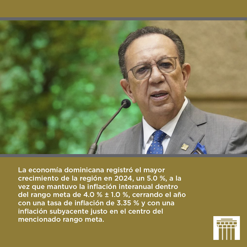 En 2024, la política monetaria del Banco Central se concentró en lograr su meta de inflación y preservar la estabilidad macroeconómica, lo que le permitió contribuir a crear condiciones propicias para el crecimiento alcanzado de 5.0 %. Para 2025, la institución monetaria se mantiene vigilante y dispuesta a utilizar sus instrumentos de política para cumplir con su misión de mantener la estabilidad de precios, en un escenario global que se torna más complejo y que presenta múltiples riesgos. En ese sentido, el BCRD ratifica su compromiso ineludible con la estabilidad macroeconómica y con promover condiciones favorables que coadyuven con el crecimiento sostenido de la economía.