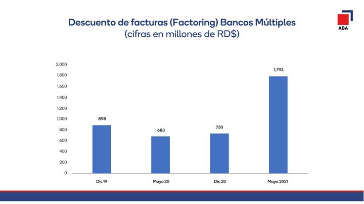 Así informó la Asociación de Bancos Múltiples de la República Dominicana (ABA), tras explicar que, a diciembre de 2020, el monto de Descuentos de Facturas era de RD$730 millones y pasó a totalizar RD$1,793 millones al finalizar mayo de 2021. Esta cifra es prácticamente el doble de lo registrado hasta diciembre de 2019, cuando alcanzaba RD$898 millones.