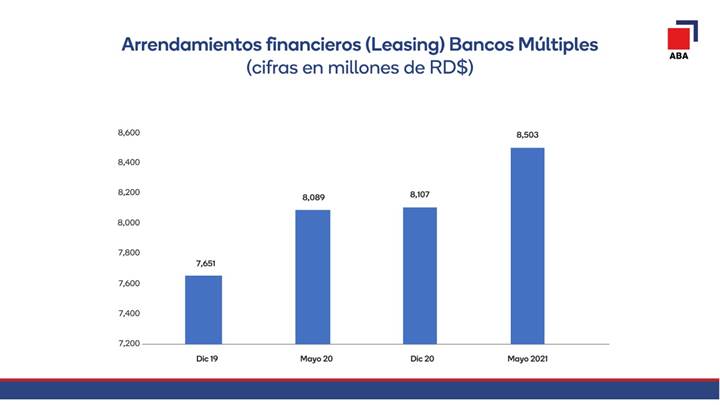 Por su parte, la ABA informó que los arrendamientos financieros (leasing) de los bancos múltiples alcanzaron los RD$8,503 millones al finalizar el mes de mayo, lo que significó un incremento de RD$395 millones durante los primeros cinco meses de 2021, equivalente a un crecimiento de 4.9%.