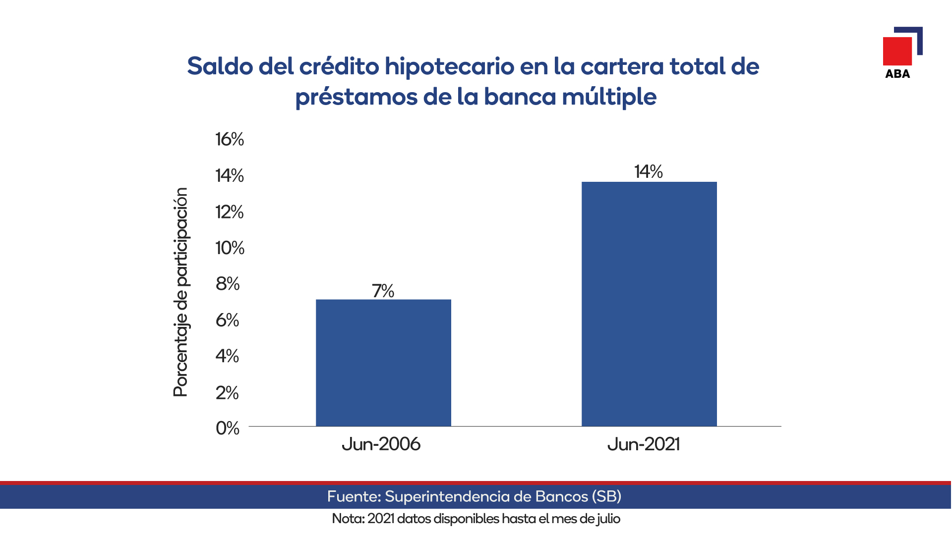 El gremio que agrupa a los bancos múltiples afirmó que esos resultados se ubican por encima de la cartera total que, durante ese mismo período, creció a una tasa anual promedio de 13.7%. Resaltó que, gracias a esa dinámica, el crédito hipotecario y para mejoras a la vivienda pasó de representar un 7% en 2006 a un 14% en 2021.