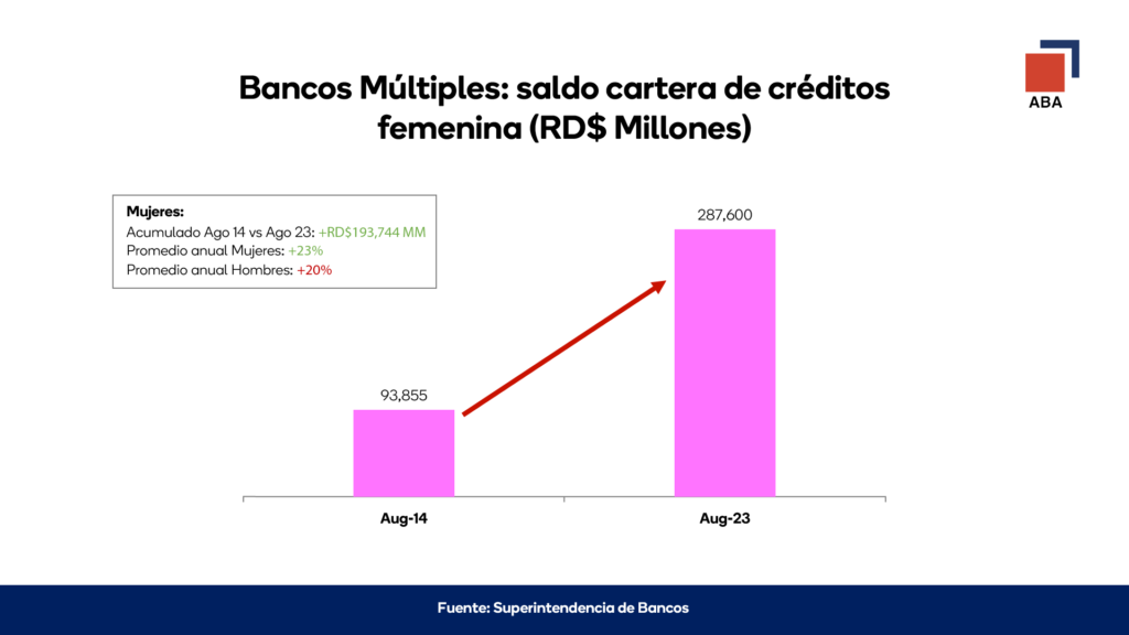 Expresó que otro segmento relevante ha sido el financiamiento a las mujeres, que totaliza 2.3 millones de créditos, que ellas utilizan mayormente en el hogar o en el desarrollo de emprendimientos. En tal sentido, precisó que el saldo de la cartera de créditos femenina se ubicó en RD$283,600 millones a agosto de 2023, lo que representa un incremento de RD$193,744 millones con respecto a 2014 y un crecimiento 17% más rápido que el del crédito masculino.