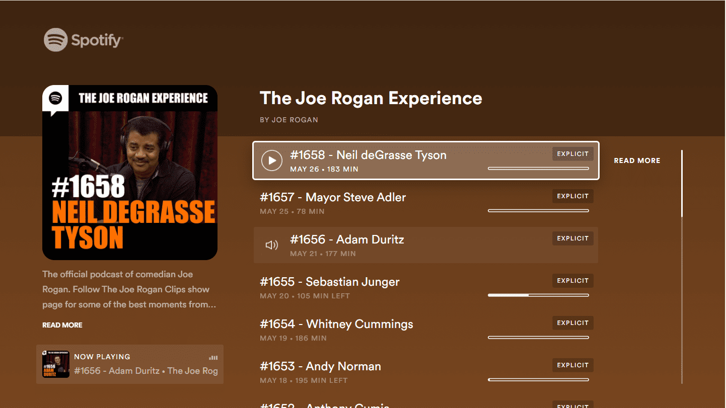 Con la nueva función que ofrece video podcasts, los usuarios de LG TV pueden disfrutar mejor de la experiencia de visualización gracias a los televisores de gran tamaño de LG. Los usuarios de Spotify Gratis y Premium podrán conectarse visualmente con sus creadores favoritos y disfrutar de video podcasts populares como The Joe Rogan Experience, The Misfits y Higher Learning con Van Lathan y Rachel Lindsay, durante horas de entretenimiento atractivo.