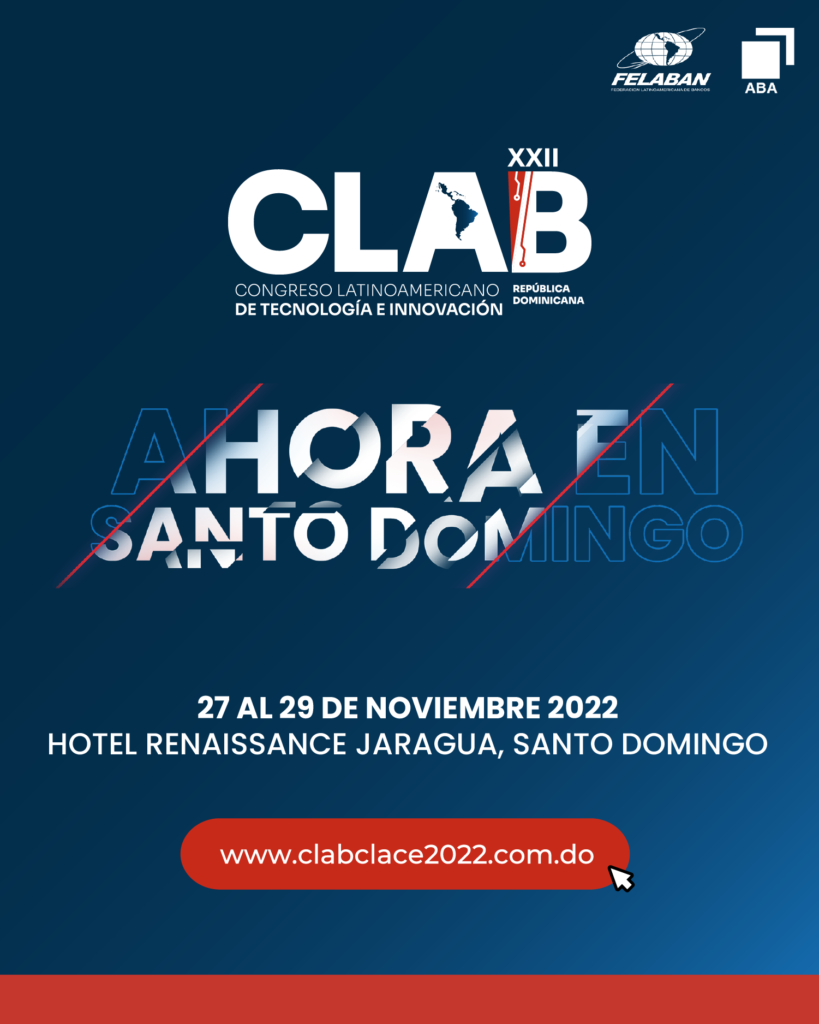 Santo Domingo, R. D. Noviembre 10, 2022.- Bajo el lema “Innovación, Tecnología y Seguridad: Transformación acelerada de los medios de pagos y servicios financieros”, se realizará del 27 al 29 de este mes el XXII Congreso Latinoamericano de Tecnología e Innovación (CLAB), evento que contará con la participación 55 expositores nacionales e internacionales.