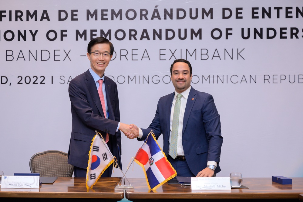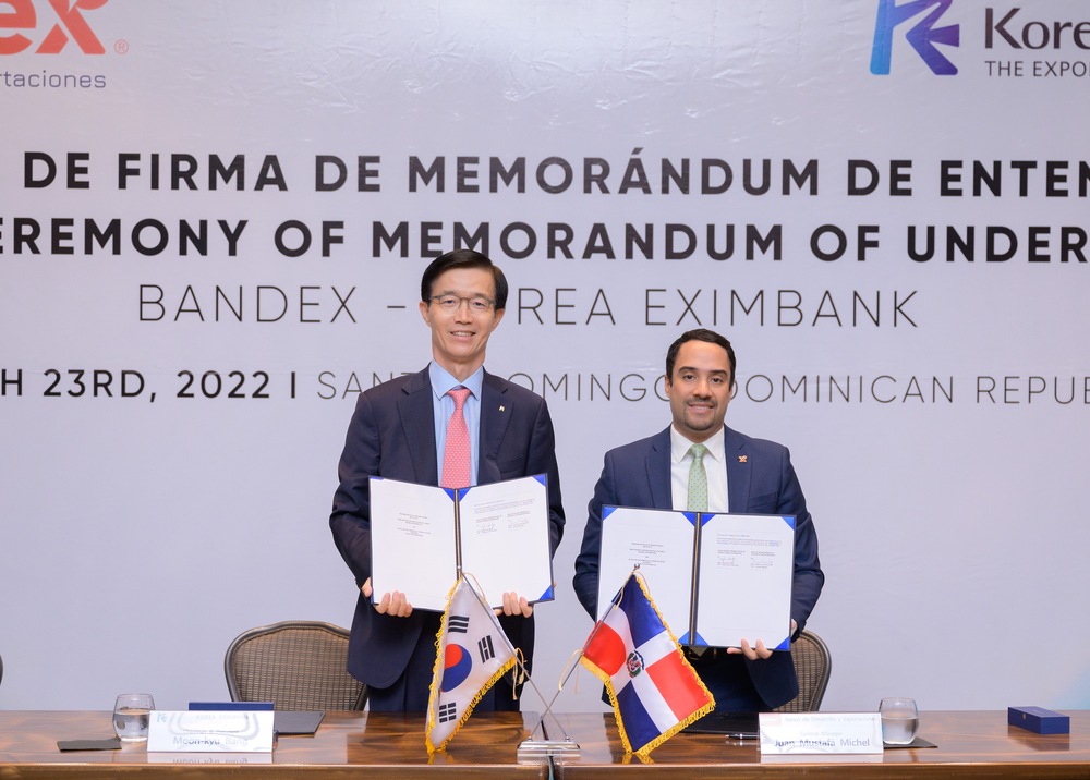 SANTO DOMINGO, R.D. Marzo 31, 2022.- El Banco Nacional de las Exportaciones (BANDEX) y el Export-Import Bank of Korea (Banco de Exportación e Importación de Corea) firmaron un memorando de entendimiento para promover la cooperación económica y oportunidades de desarrollo empresarial de importación y exportación de bienes y servicios entre ambos países por un monto de hasta 100 millones de dólares.
