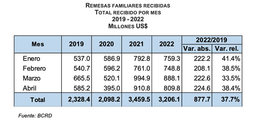 El BCRD señala que, en el mes de abril de 2022, particularmente, las remesas sumaron US$809.8 millones. Estas cifras reafirman el establecimiento de un nuevo nivel de flujos de remesas mensuales en torno a los US$800.0 millones. En ese sentido, al comparar este monto de abril de 2022 con el valor promediado en el mismo mes para el período previo a la pandemia de 2015-2019, que fue de US$489.0 millones, se observa un aumento importante.
