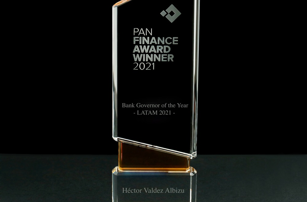 El galardón incluye un trofeo y un certificado que lo motiva: “Héctor Valdez Albizu ha sido galardonado Gobernador de Banco del año, LatAm 2021. Establecido para ser una verdadera medida de excelencia, el programa de premios Pan Finance celebra ejemplos destacados de mejores prácticas. Este premio ha sido otorgado como reconocimiento a la excelencia”.