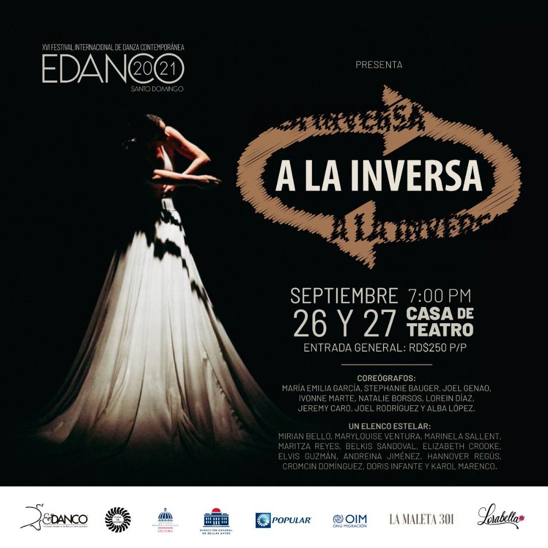 La presentación inaugural de Edanco 2021 será a las 7:00 de la noche, en Casa de Teatro con el espectáculo “A la inversa”. En esta presentación, que se repetirá el lunes el lunes 27, a las 7:00 de la noche, los asistentes disfrutarán un hermoso trabajo coreográfico con artistas jóvenes coreografiando a maestros retirados con trayectoria en la danza en dominicana.