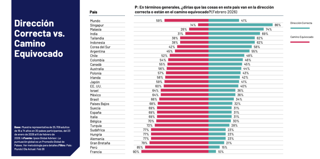 En paralelo, el Índice Ipsos Global de Confianza del Consumidor muestra un escenario más desafiante. Con 44,7 puntos en febrero de 2026, Argentina se ubica en el último lugar de América Latina y en la posición 25 entre los 30 países medidos a nivel mundial. La caída anual de 7,3 puntos representa además el deterioro más pronunciado entre todos los países analizados. Mientras Colombia lidera la región con 54,8 puntos, seguida por México (53,3), Brasil (52,7), Chile (50,3) y Perú (49,7), Argentina se ubica más de diez puntos por debajo del líder regional.