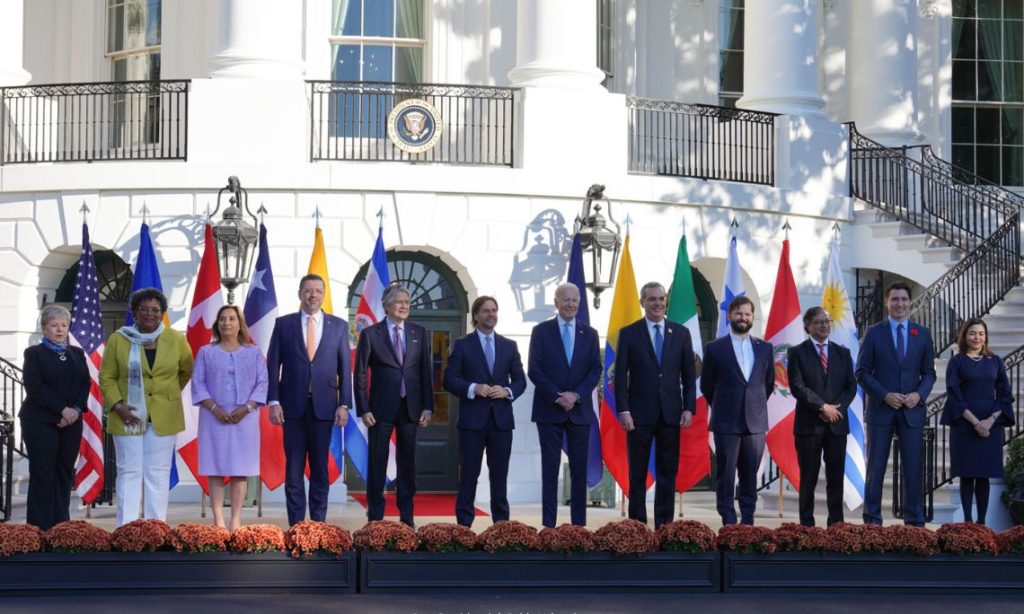 Washington, D.C. Noviembre 3, 2023.- Nosotros, los mandatarios de Barbados, Canadá, Chile, Colombia, Costa Rica, Ecuador, Estados Unidos, México, Panamá, Perú, República Dominicana y Uruguay, compartimos una visión de un hemisferio más abierto, justo, inclusivo, sostenible y próspero. Contemplamos un futuro más esperanzador para todos los pueblos de las Américas en el que economías dinámicas construyan sociedades más equitativas y los gobiernos democráticos, a través de instituciones eficaces, ofrezcan resultados para todos. Para tal fin, reconocemos la necesidad de acelerar las inversiones y el comercio inclusivos y sostenibles en la región, abordar la crisis climática y expandir oportunidades sociales y económicas que no dejen a ninguna persona rezagada. Reafirmamos nuestro compromiso colectivo con nuestros valores comunes, como la democracia, el estado de derecho, la diversidad y la inclusión, el trabajo digno y bien remunerado, la protección social y ambiental, los derechos laborales, los derechos humanos universales y las libertades fundamentales en las Américas.