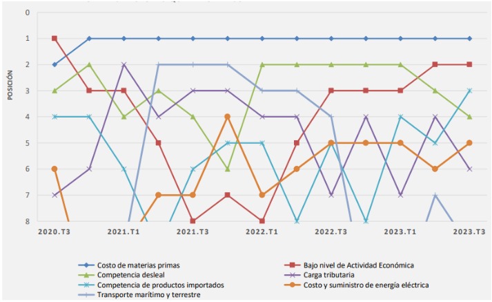 En cambio, la “competencia desleal” continuó descendiendo en su importancia como factor que afecta la competitividad, pasando de un segundo lugar en el primer trimestre del presente año, a un tercer lugar en el segundo trimestre, y un cuarto lugar en el trimestre julio-septiembre 2023 (tercer trimestre).