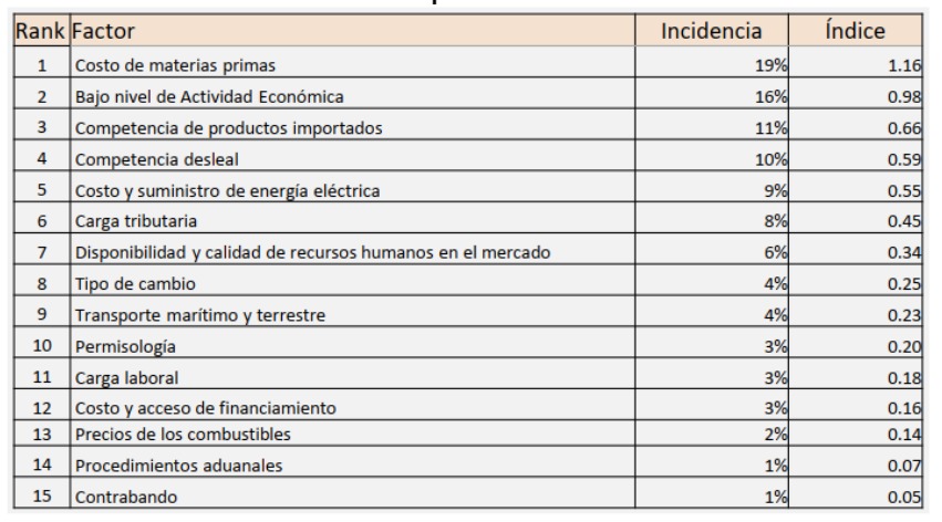 El “costo de energía eléctrica” incrementó su importancia, pasando de sexto a quinto lugar.