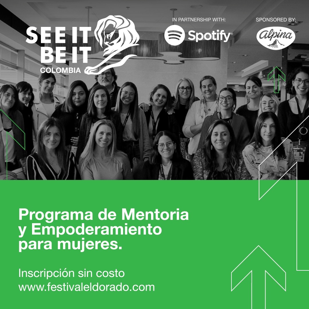 A su vez, el Festival ElDorado desarrollará el programa de mentoría y empoderamiento de mujeres CANNES LIONS SEE IT BE IT, que nace como respuesta a la desigualdad de género en la industria de la publicidad y las comunicaciones, con el objetivo de cambiar la proporción de mujeres líderes en departamentos creativos de agencias. Para fomentar el cambio, un selecto grupo de 8 mujeres colombianas serán elegidas, sin ningún costo, para participar en una serie de actividades donde tendrán acceso a la sala de juzgamiento, sesiones y mentorías uno a uno con algunos de los líderes más respetados de la industria y una variedad de oportunidades de networking a su alcance diseñadas especialmente para impulsar su carrera.
