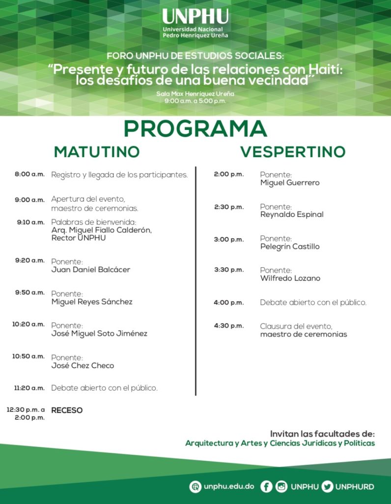 El Foro de la Universidad Nacional Pedro Henríquez Ureña (UNPHU) de Estudios Sociales celebrará mañana jueves (19 de enero), el primero de una serie de seminarios sobre el presente y futuro de las relaciones con Haití.