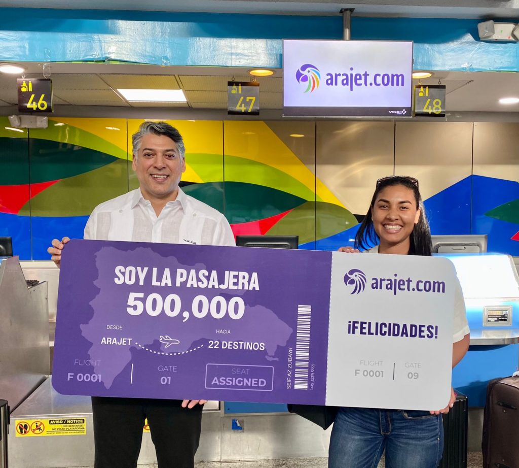 La aerolínea informó que Carolyn Rijo, quien abordó un vuelo de Santo Domingo a Medellín, fue la pasajera número 500 mil y recibió como regalo un ticket aéreo para dos personas que podrá utilizar para viajar a cualquiera de los 22 destinos en 15 países a los que vuela Arajet.