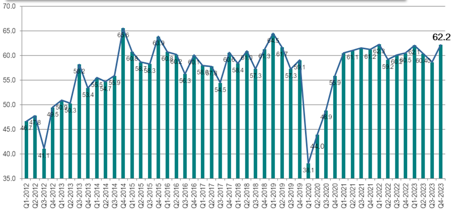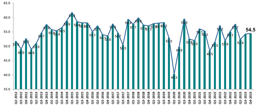 En el ICE se mantiene una percepción positiva (sobre 50.0), y pasó de 58.7 en el tercer trimestre a 62.2 en el cuarto trimestre 2023.