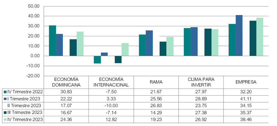Santo Domingo. El Índice de Confianza Industrial (ICI) ascendió ligeramente al pasar de 54.3 en el tercer trimestre de 2023 (julio-septiembre) a 54.5 en el cuarto trimestre (octubre-diciembre).  El ascenso en el Índice de Clima Empresarial (ICE)fue mayor al pasar de 58.7 en el tercer trimestre a 62.2 en el cuarto trimestre, luego de haber mostrado una tendencia descendente en los primeros tres trimestres del pasado año.