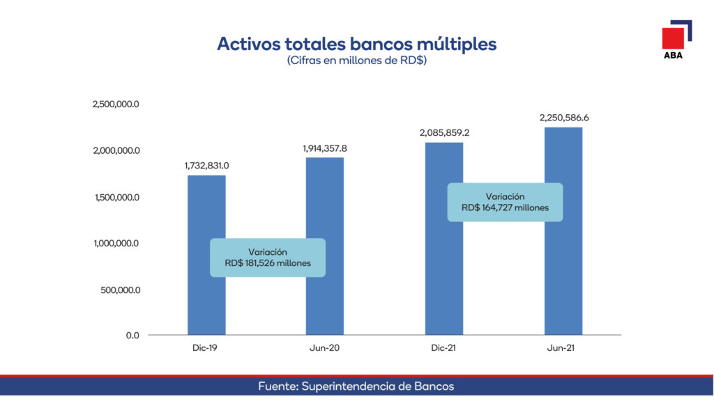 Santo Domingo, D.N., R.D. Agosto, 2021.- Los activos de la banca múltiple de la República Dominicana registraron un valor total de RD2,250.6 mil millones a junio de 2021, reflejando un crecimiento de RD$164,727.4 millones durante el primer semestre del año, es decir 7,9% más que el período anterior, informó la Asociación de Bancos Múltiples de la República Dominicana (ABA), al tiempo de resaltar que estos resultados fueron en consonancia con el desempeño de la economía en la primera mitad del año.