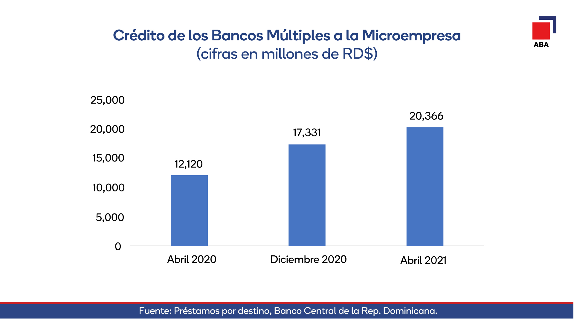 En un documento de prensa, la ABA detalló que el saldo de la cartera de financiamiento a las microempresas pasó de RD$17,331 millones en diciembre de 2020 a RD$20,366 millones al mes de abril 2021, acorde a estadísticas del Banco Central de la República Dominicana.