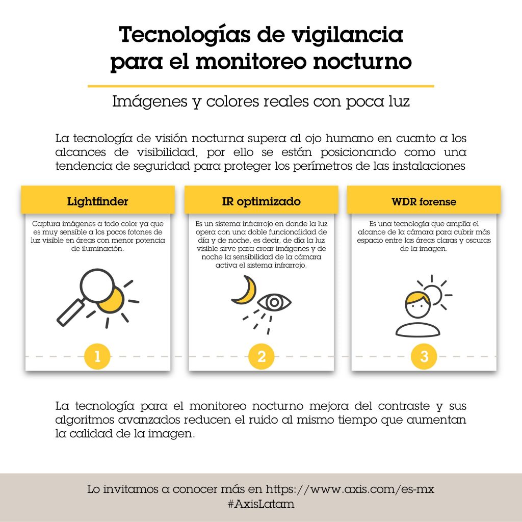 El experto en tecnología de video, Ignacio Cabañas, Business Development Manager para Axis en Latinoamérica, menciona que “se requiere de soluciones capaces de monitorear en la oscuridad para asegurar todas aquellas infraestructuras donde el monitoreo continuo implica garantizar el funcionamiento de las actividades y la seguridad física de las personas y activos”.